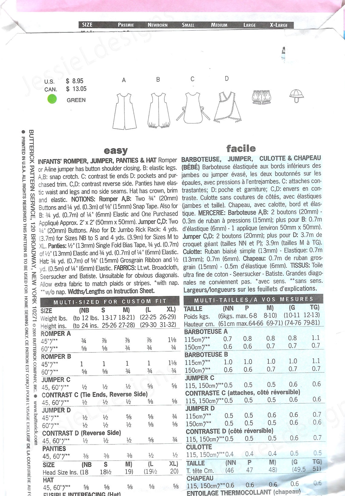 Butterick 5625 Infants' Romper, Jumper, Panties and Hat PatternL-XL ...