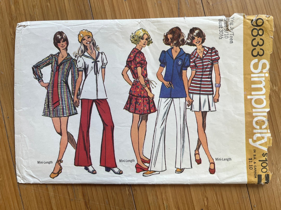 70s Simplicity 9833 Sailor Mini Dress or Skirt and Blouse Bell Bottoms ...
