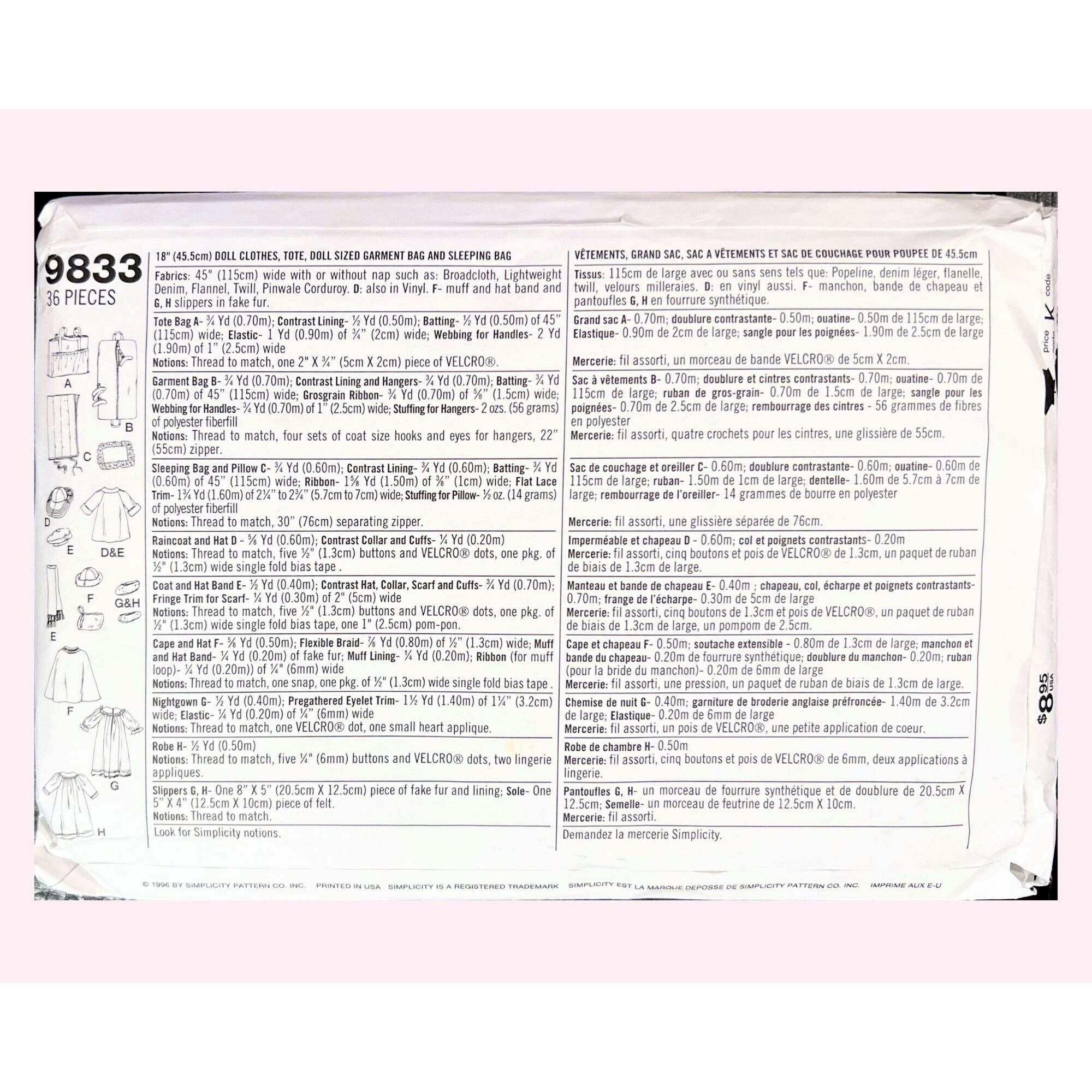 9833 Simplicity Sewing Pattern 18" Doll Clothes Tote Garment Bag ...
