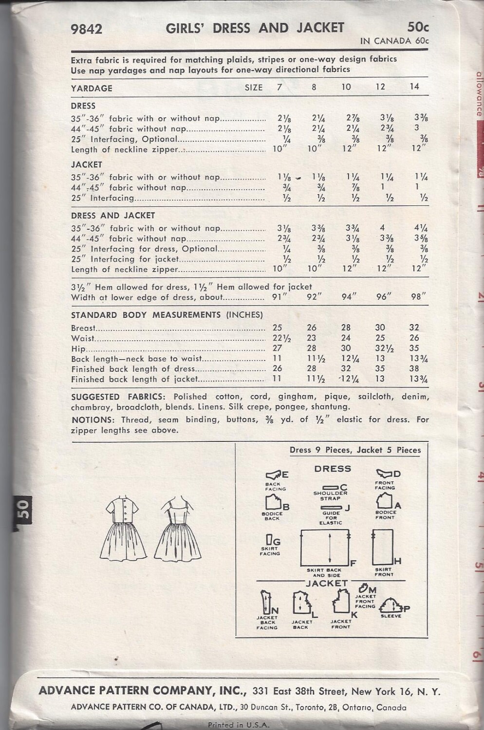 Advance 9842 Pattern for Girls' Dress & Jacket, Size 14, From Early ...