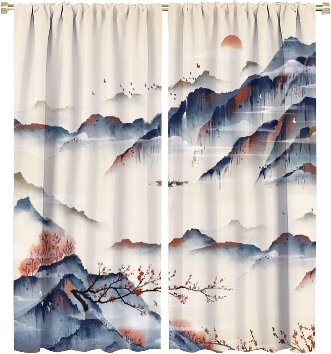 Asian Landscape Blackout Curtains, Plum Blossom Cloud Mountain Pattern ...