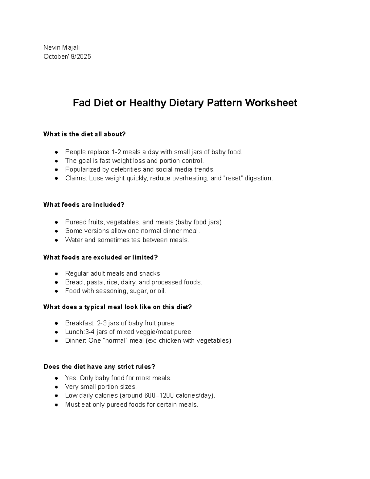 Healthy Dietary Pattern Worksheet: Nevin Fad Diet Overview - Studocu