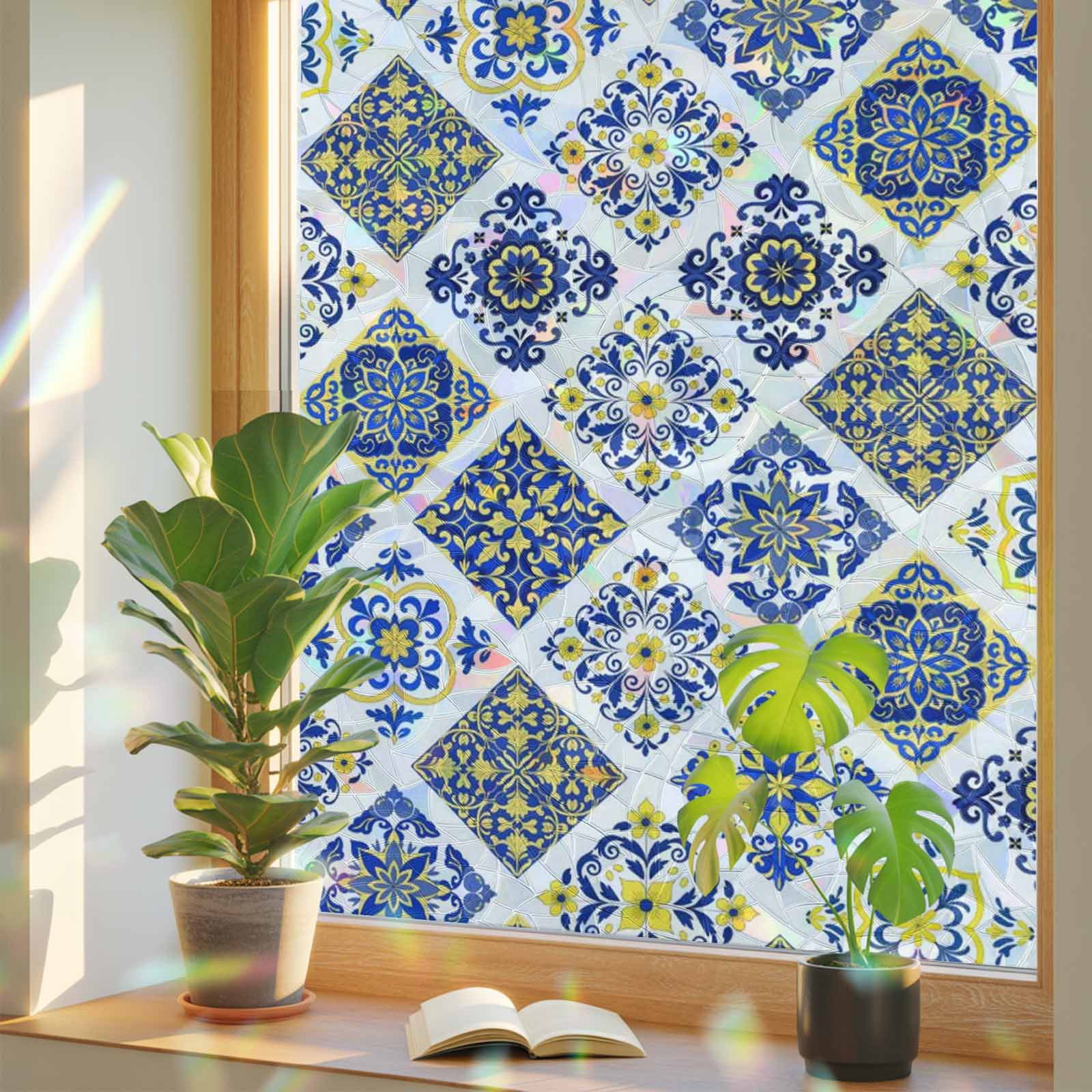 Blue Floral Pattern Window Privacy Film, Yellow Flowers Vintage Farm ...