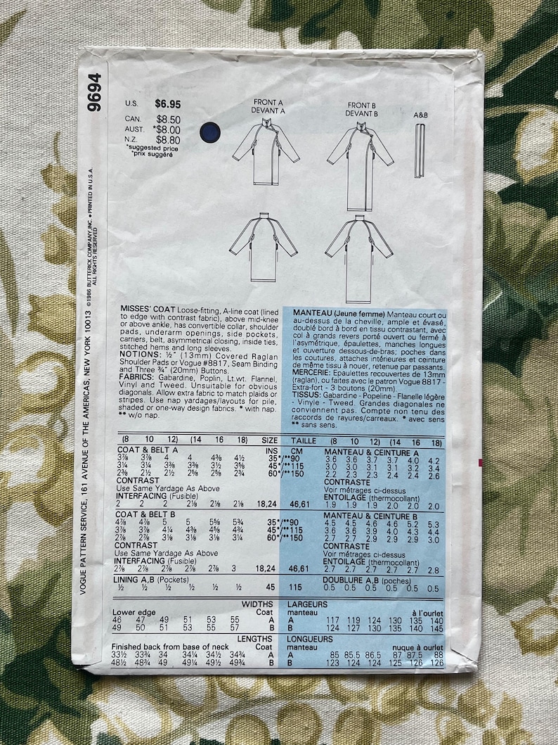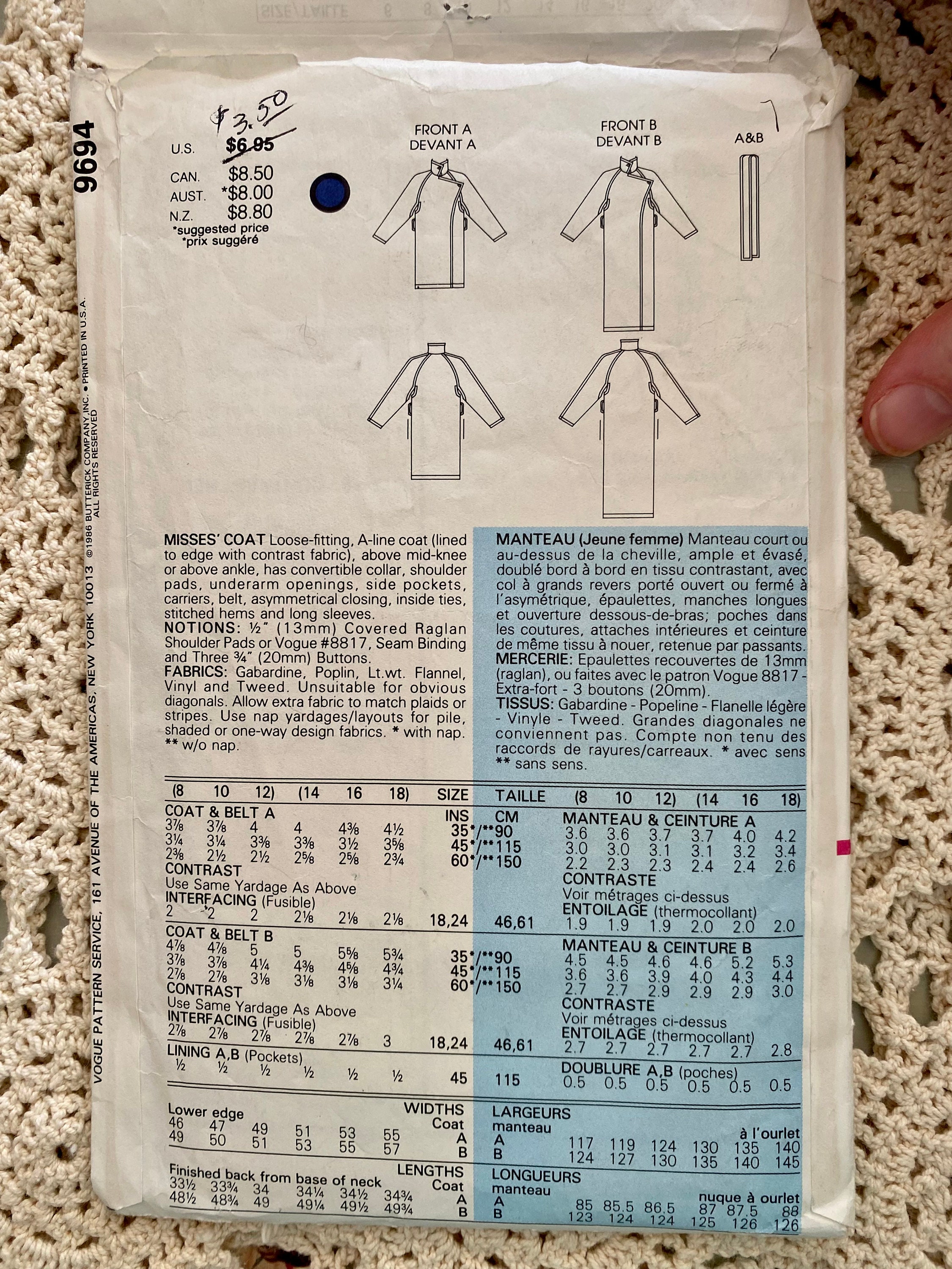 Vogue Pattern #9694 (1986) Misses' Coat UNCUT - Etsy