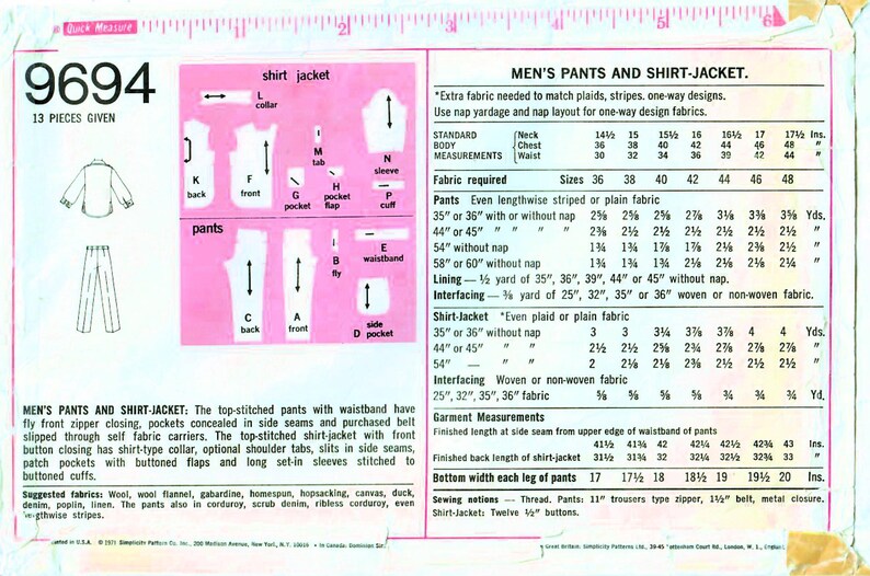 Simplicity 9694 – Chest 40 Ff. 70s Men's Pants & Flannel Shirt Jacket ...