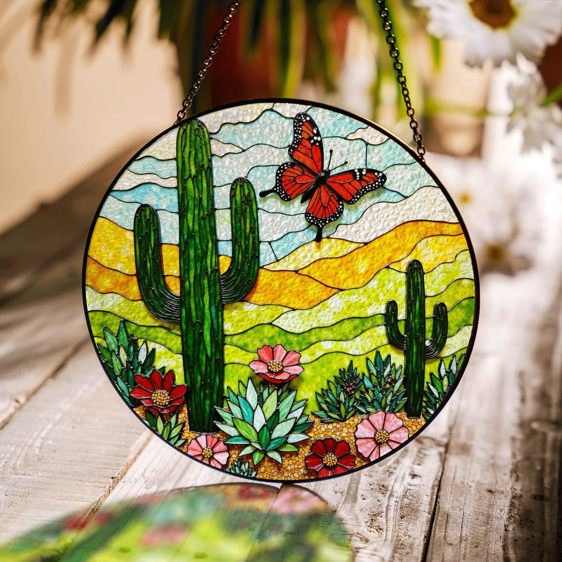 BLESSING DECOR Desert Cactus Butterfly Glass Suncatcher, Succulent ...
