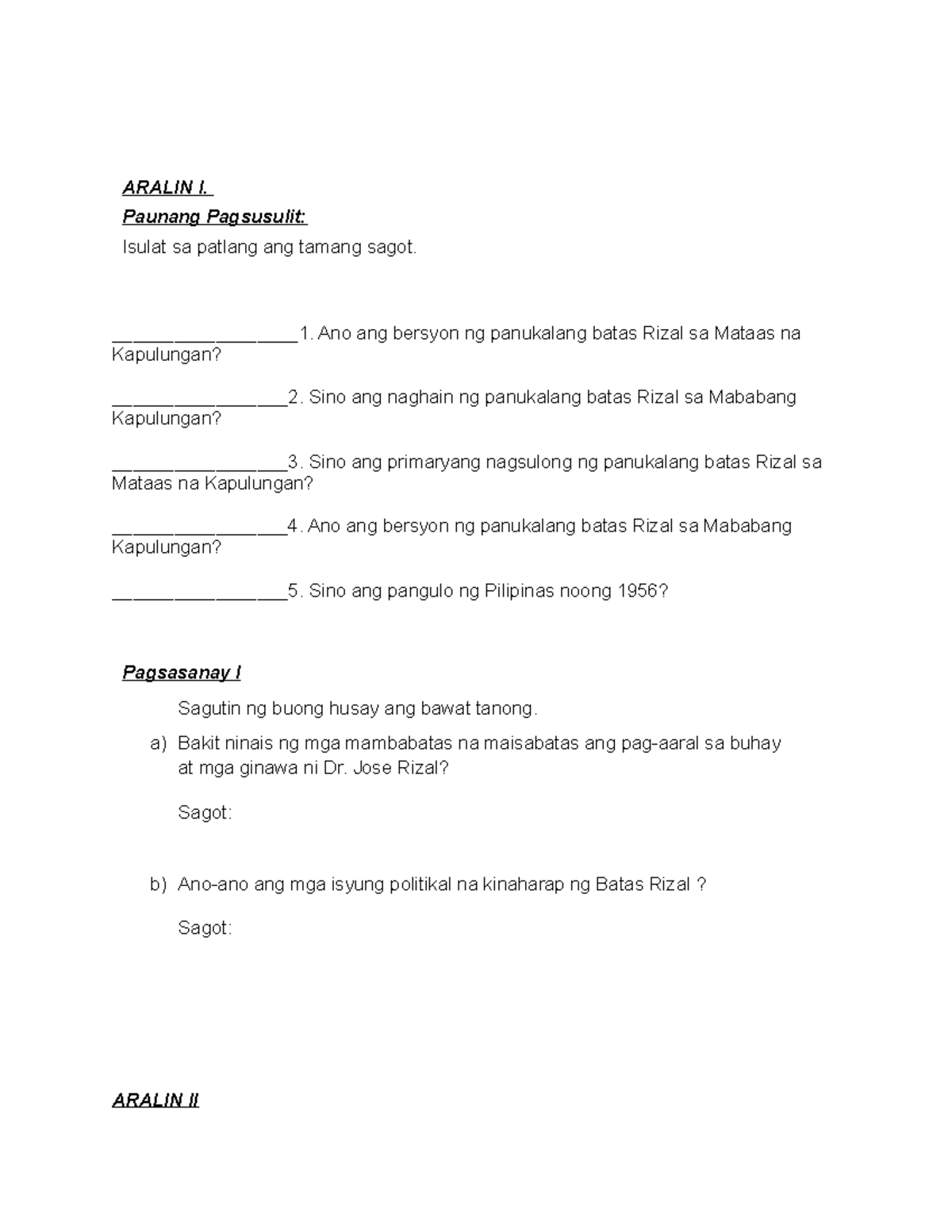 Mendoza- Vernardita-G - ARALIN I. Paunang Pagsusulit: Isulat sa patlang ...