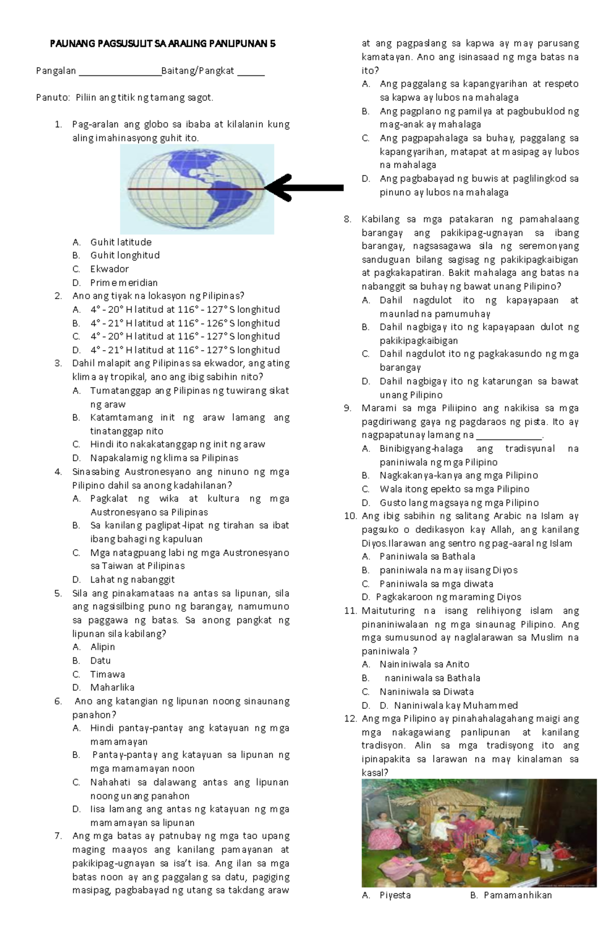 PRE-TEST Araling Panlipunan 5 - PAUNANG PAGSUSULIT SA ARALING ...