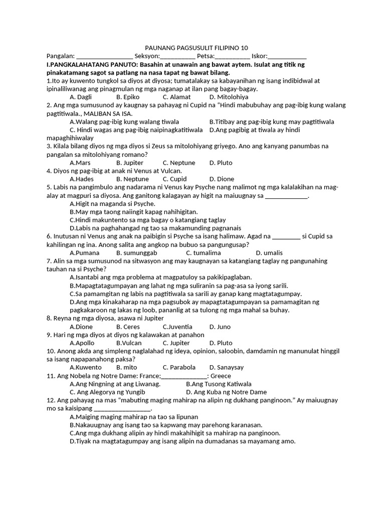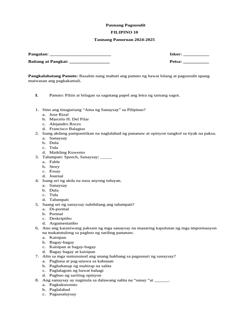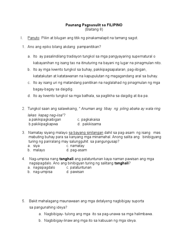 Paunang Pagsusulit sa Filipino 9: Pre-test for 9th Grade Students - Studocu