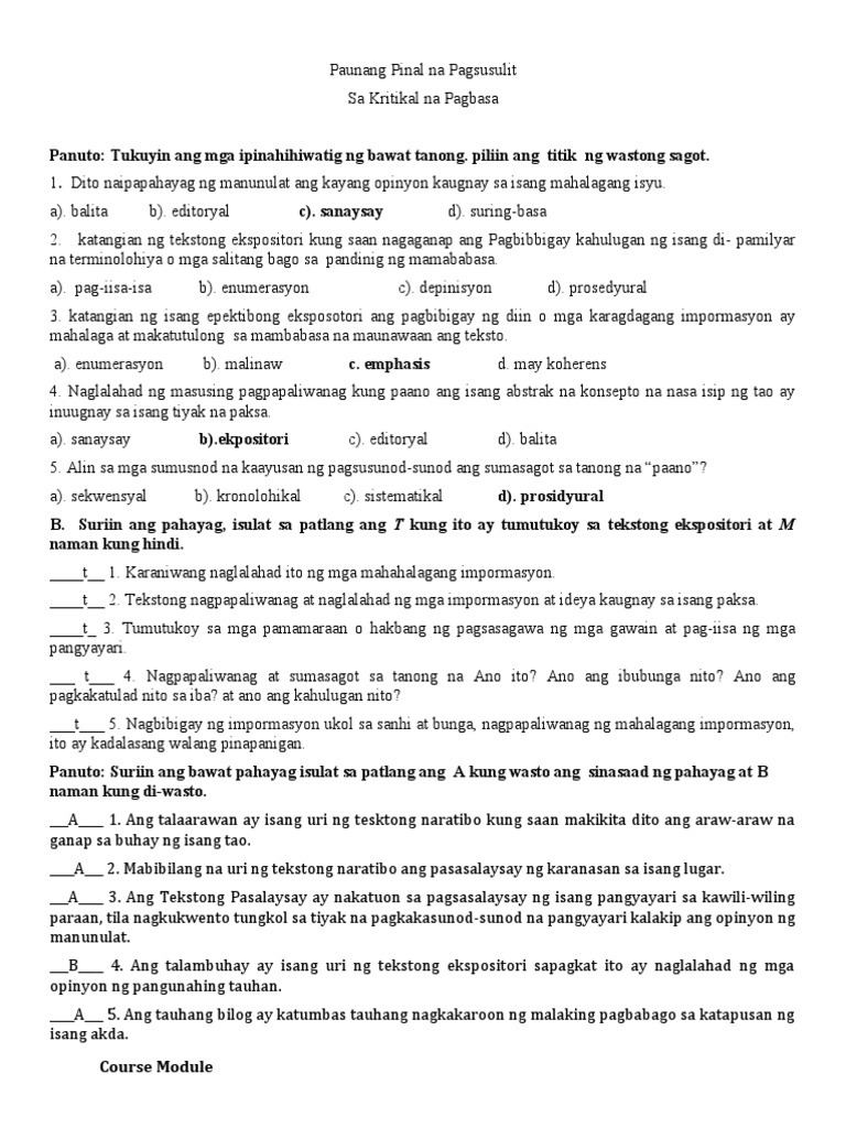 Kritikal Na Pagabsa (Paunang Pinal Na Pagsusulit) | PDF