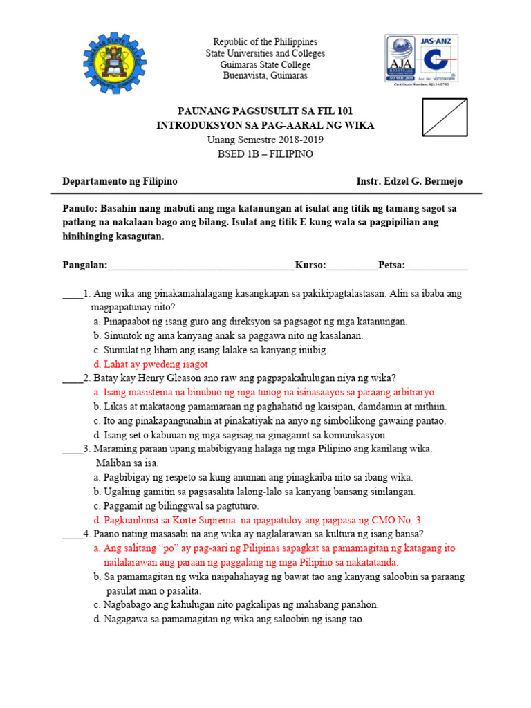 Paunang Pagsusulit Bago Mag El Fili | PDF