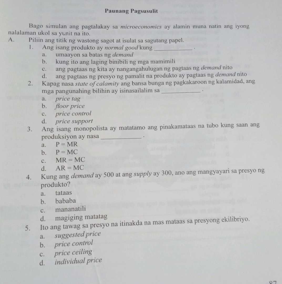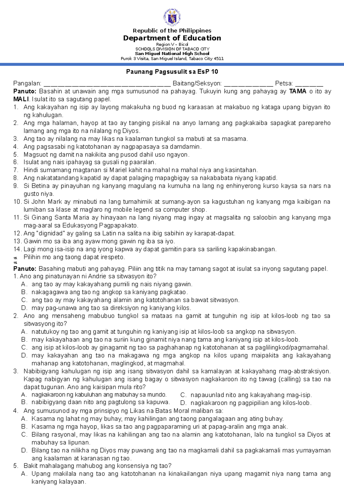 ESP 10 Paunang Pagsusulit: Mga Tanong at Panuto - Studocu