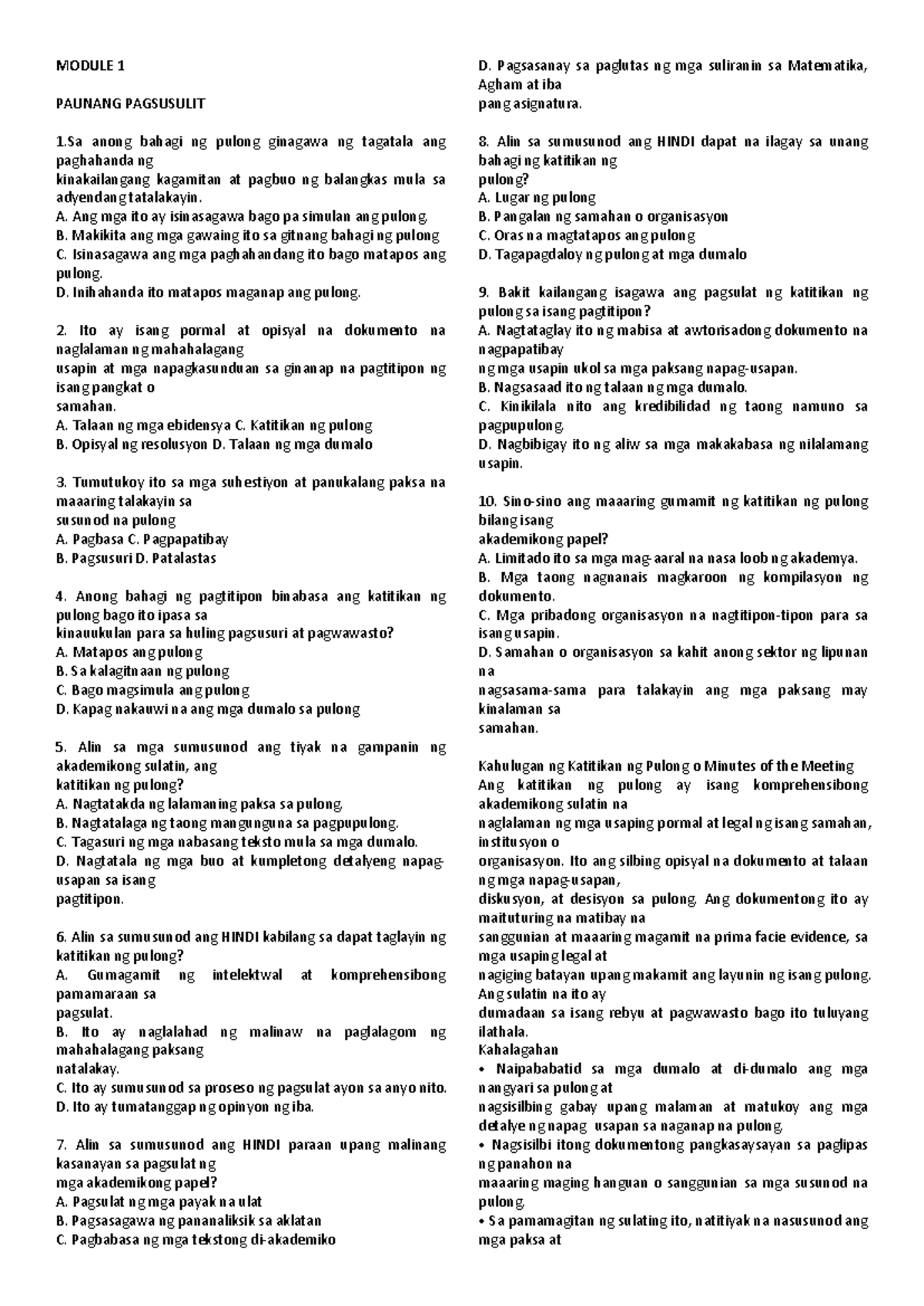 Paunang Pagtataya: Modyul 1 - Pagsusulit