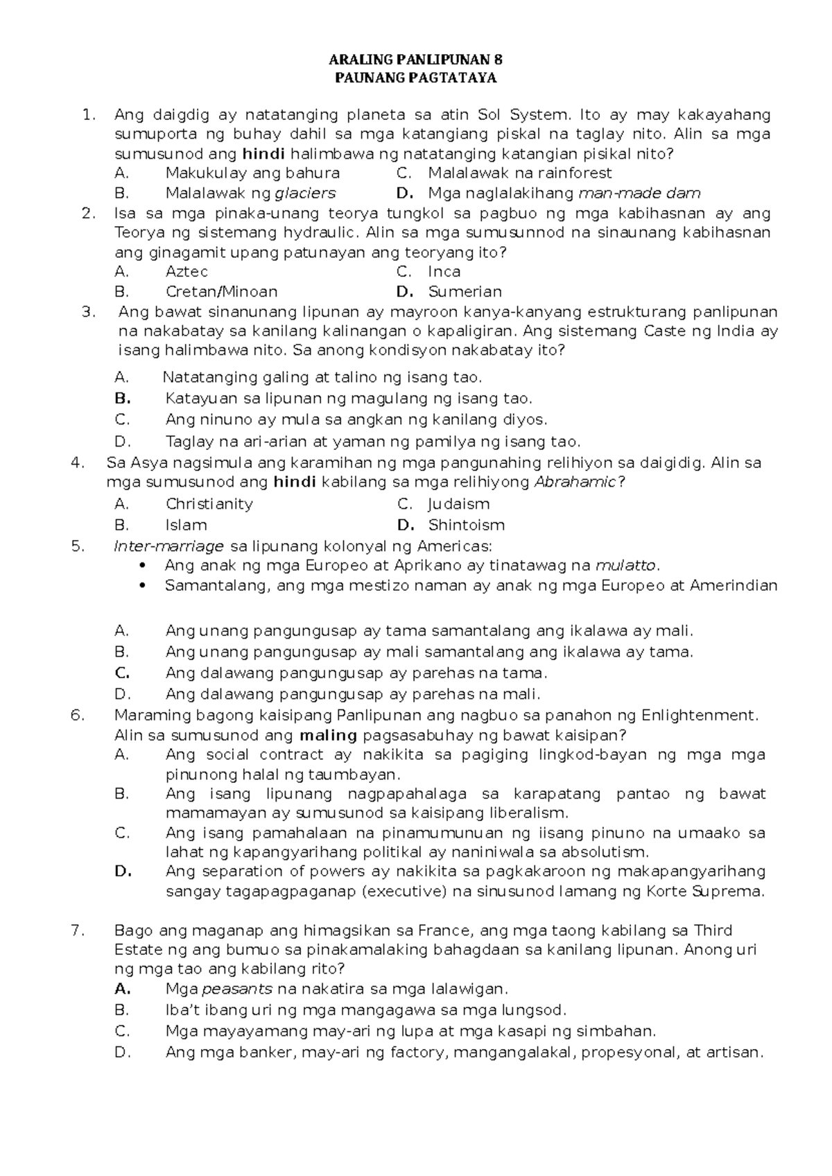 PRE-TEST Araling Panlipunan 6 - PAUNANG PAGSUSULIT SA ARALING ...