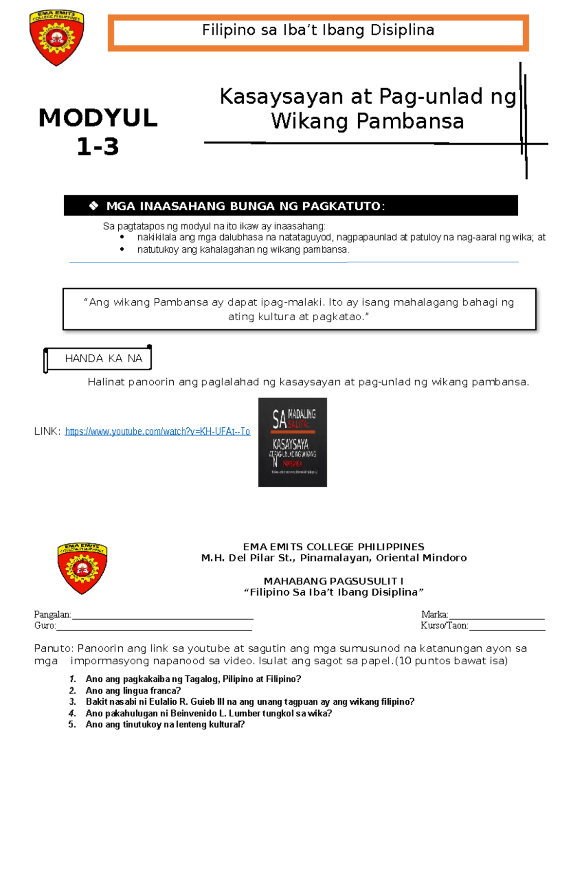 Filipino SA IBA'T-IBANG DISIPLINA: PAUNANG PAGSUSULIT MODULE 1 - Studocu