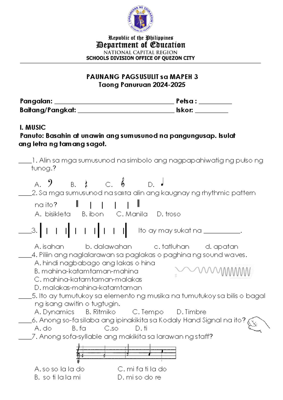 3 Mapeh Prestest 2024 TEST - PAUNANG PAGSUSULIT sa MAPEH 3 Taong ...