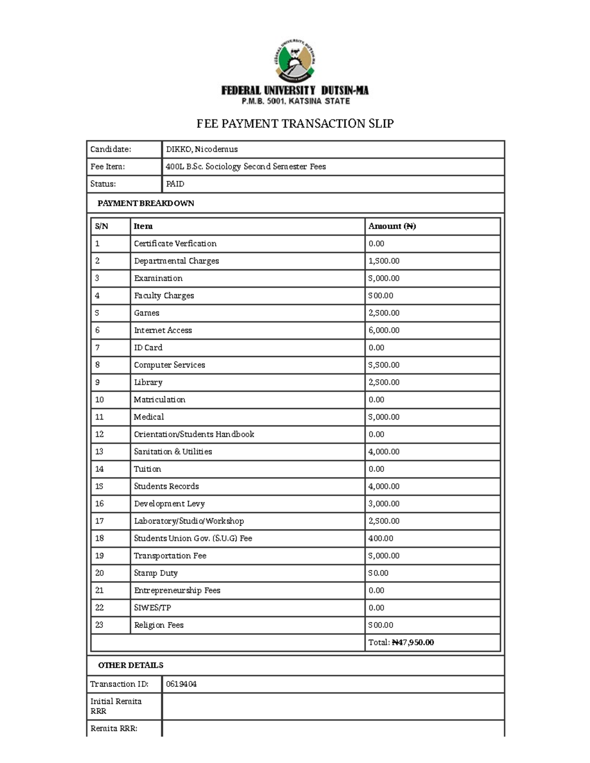 FEE PAYMENT TRANSACTION SLIP - 400L B.Sc. Sociology - Studocu