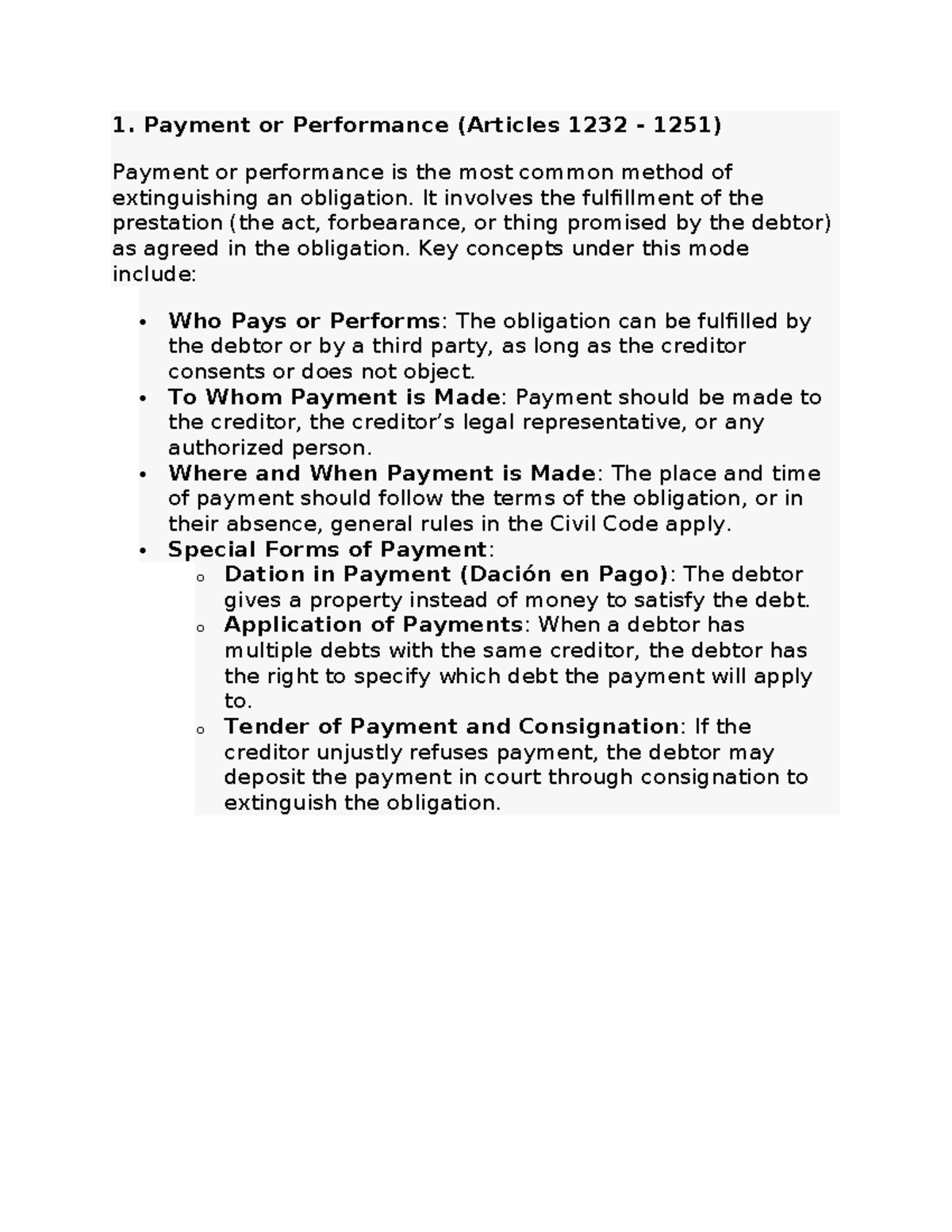 Payment or Performance: Key Concepts (Articles 1232-1251) - Studocu