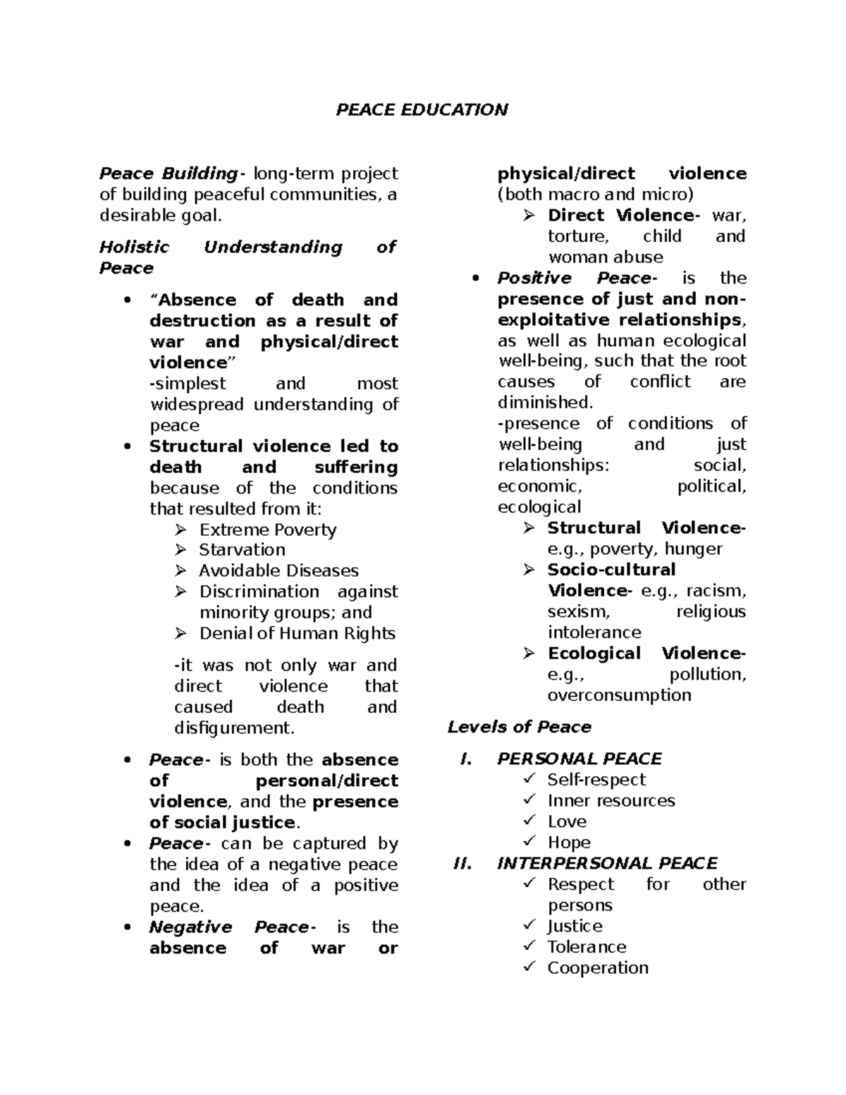 Peace Education WEEK 1-revised - PEACE EDUCATION Peace Building- long ...