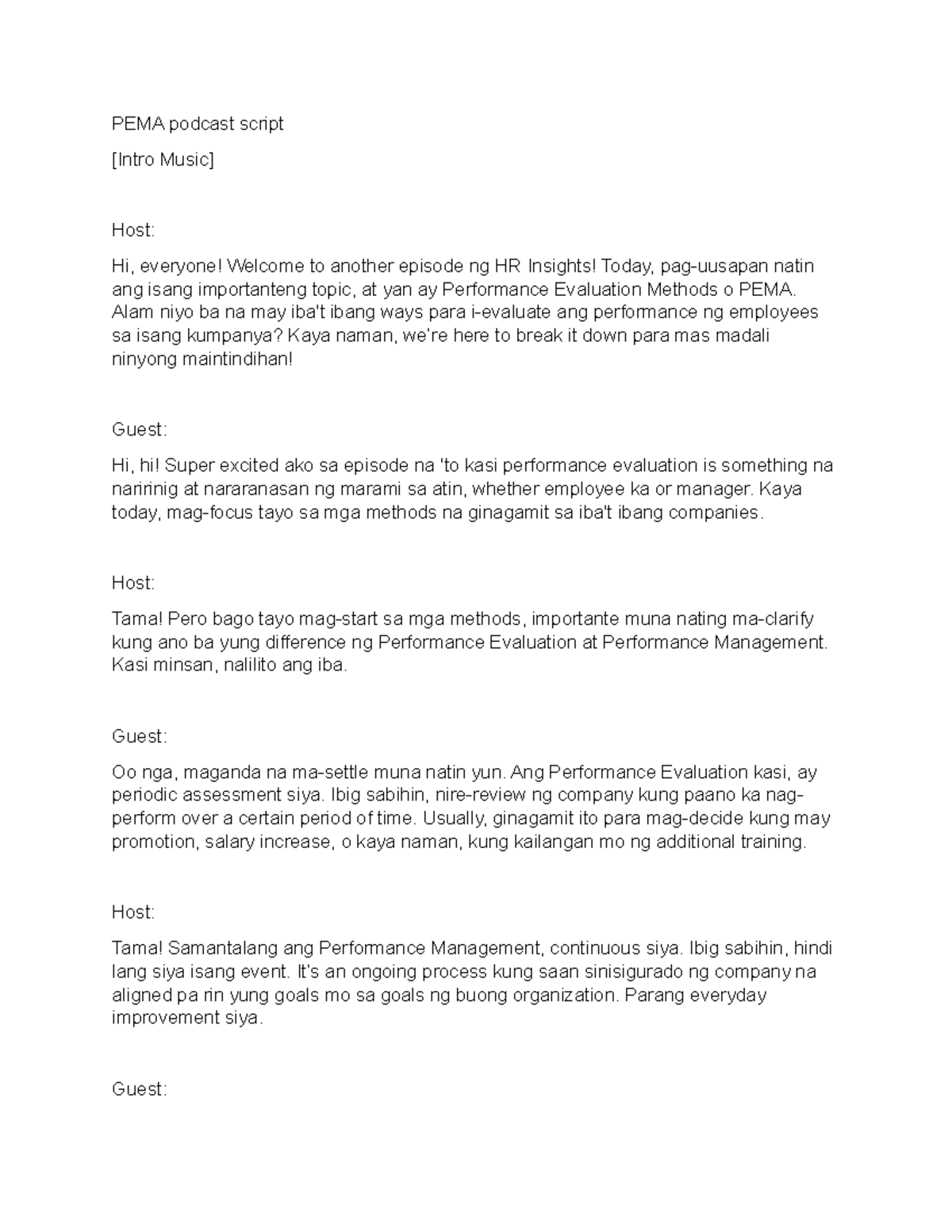 PEMA Podcast Script: Exploring Performance Evaluation Methods - Studocu