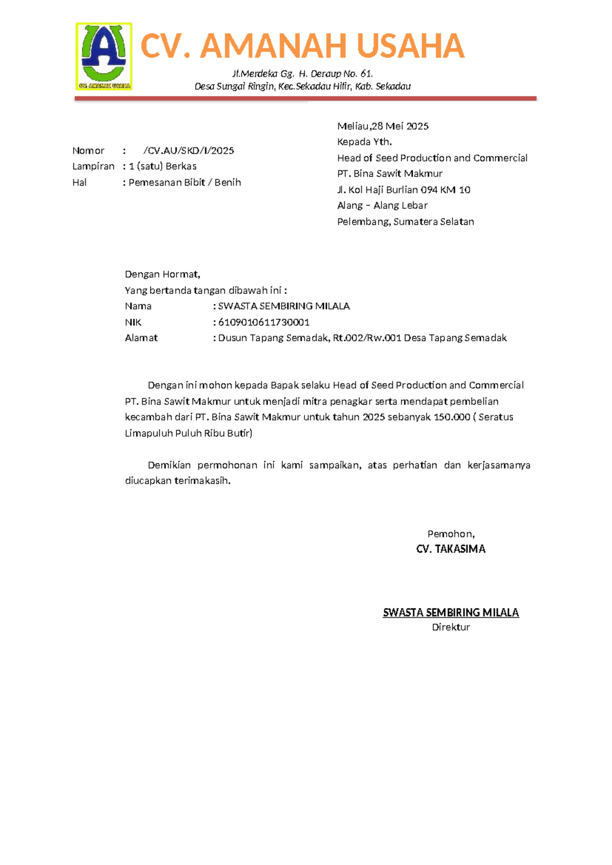 Pemesanan Bibit Benih 2025 - CV. TAKASIMA untuk PT BSM - Studocu