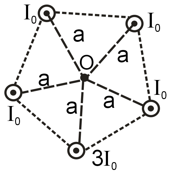 Five parallel infinite wires are placed at the vertices of a regular ...