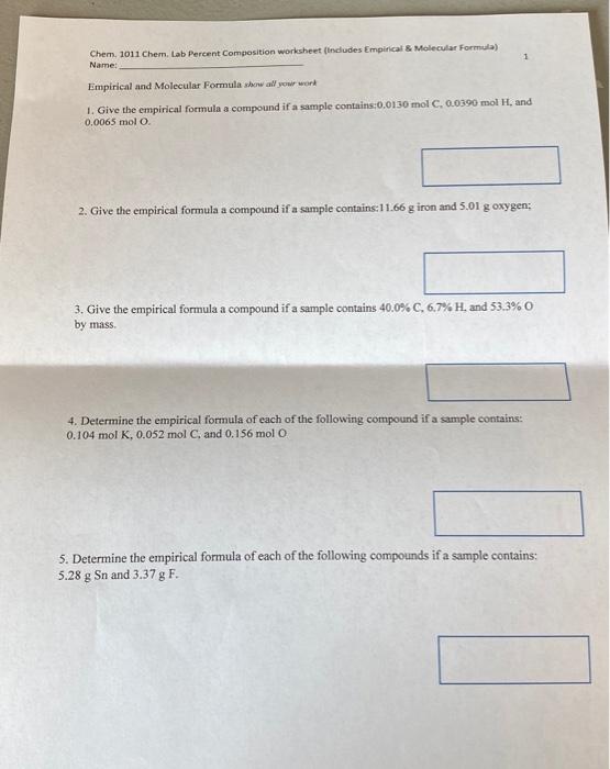 Solved Chem. 1011 Chem. Lab Percent Composition worksheet | Chegg.com