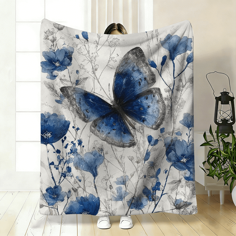 Comfortable Blue Butterfly Floral Pattern Flannel Blanket Soft High ...