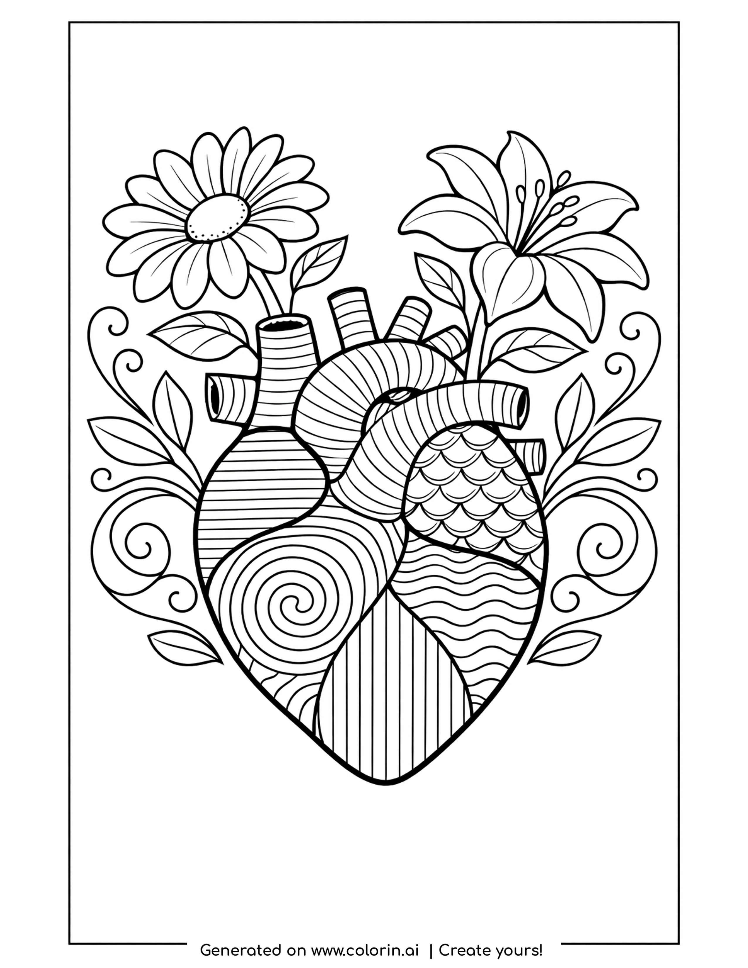 Anatomical heart with flowers growing coloring page | Relaxing art