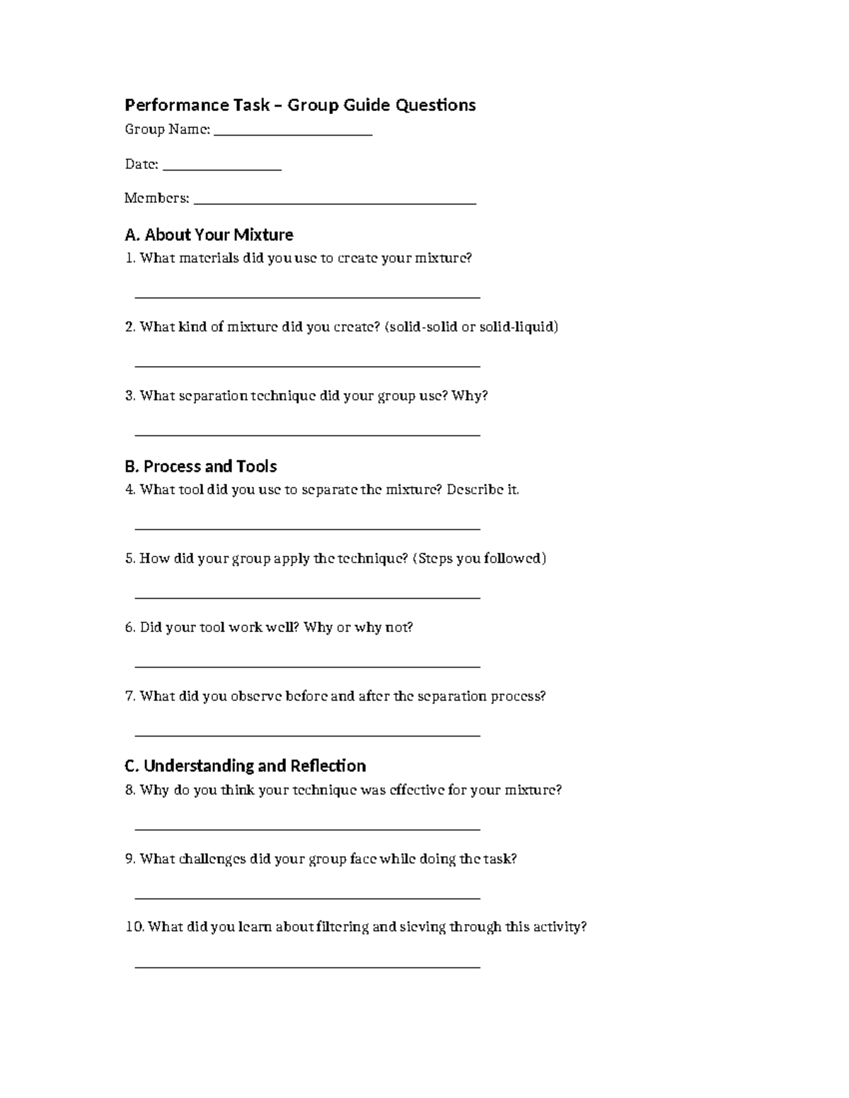 Performance Task Guide Questions: Mixture Separation Techniques - Studocu