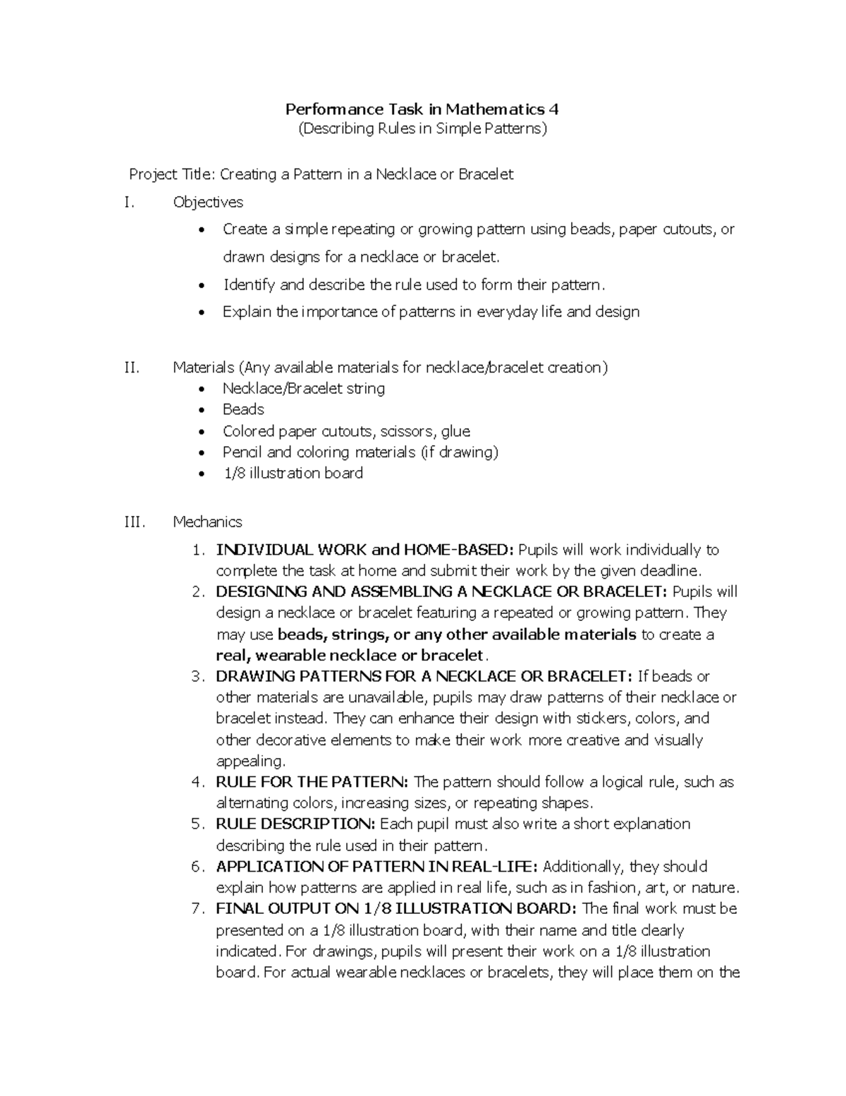Performance task guidelines for mathematics 4: creating patterns in ...