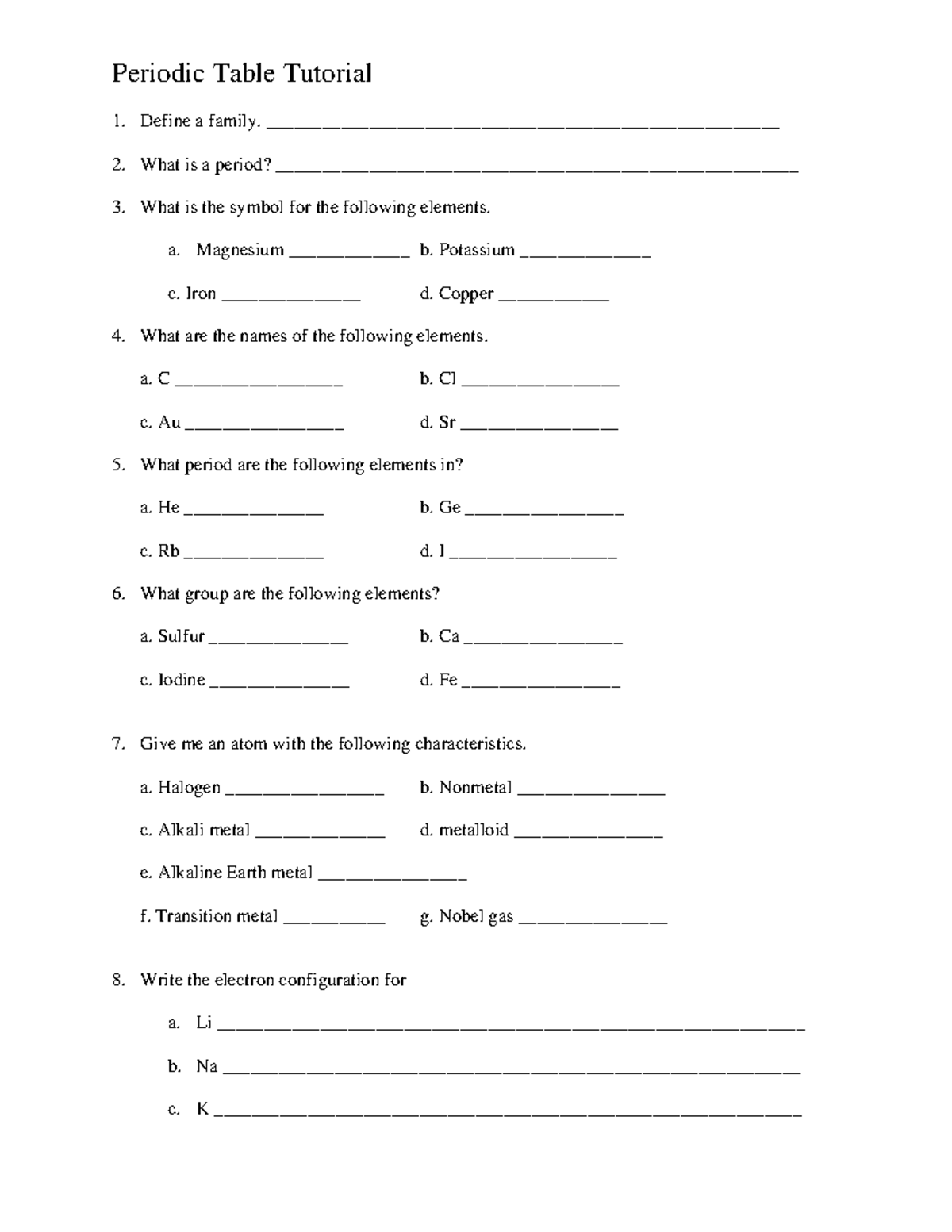 Periodic Table Families Worksheet