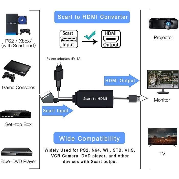 Adaptateur Peritel vers HDMI avec Câbles Péritel et HDMI, 1080P ...