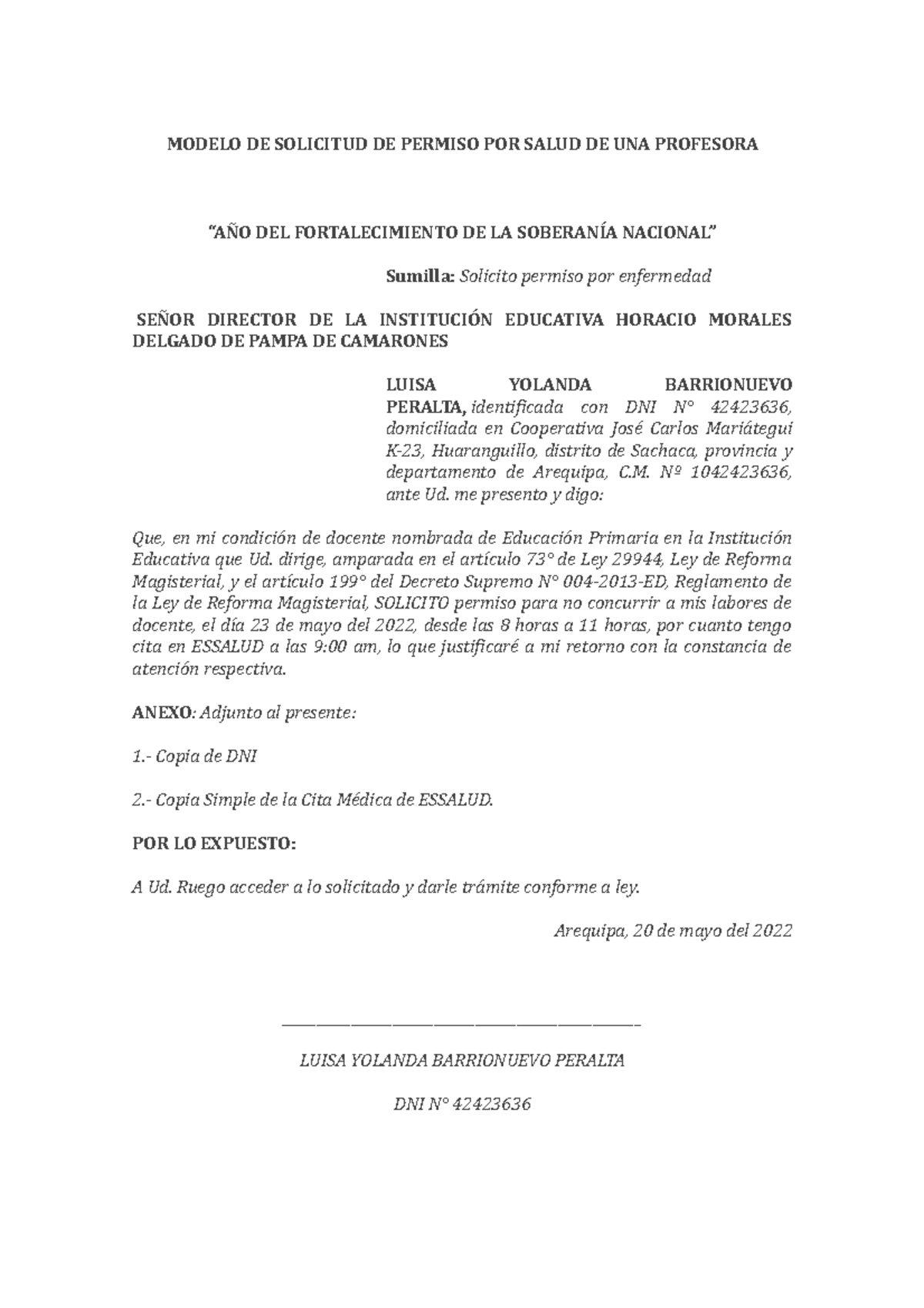 Modelo de Solicitud de Permiso por Salud de Docente - Arequipa - Studocu