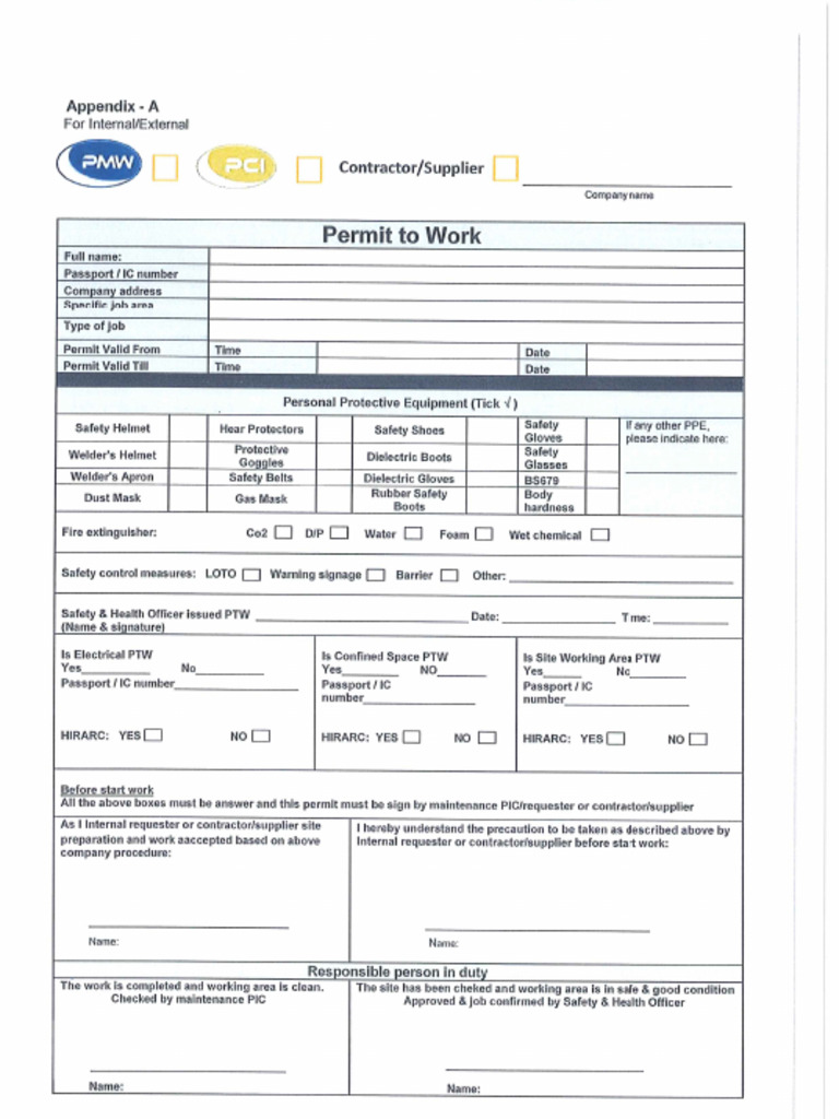 Permit to Work Form