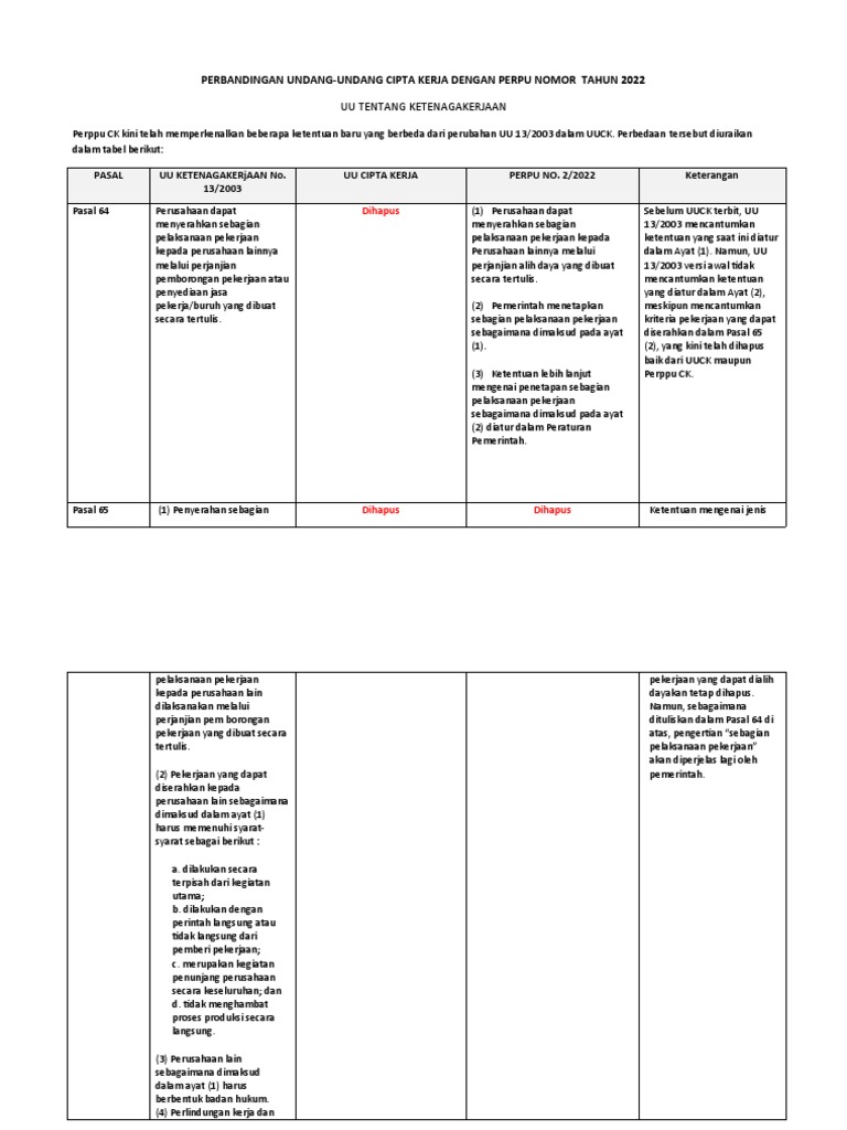 Perbandingan UU Cipta Kerja dan Perppu 2022 | PDF