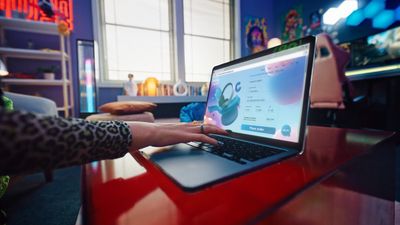 A young woman with pink hair smiles using a computer in a vibrant ...