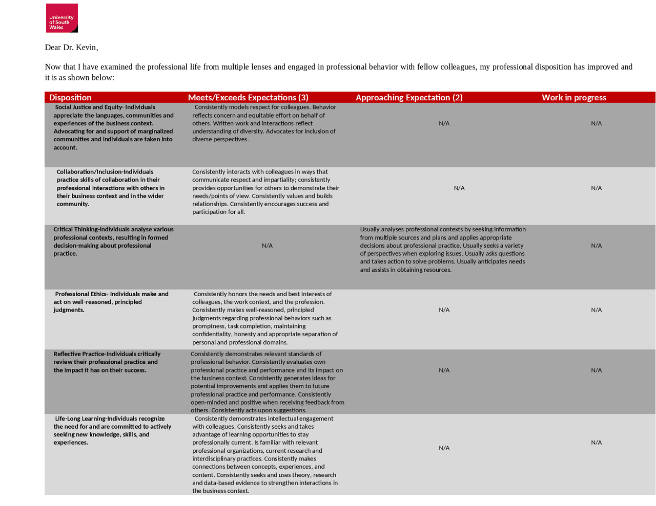 Professional disposition-self assessment - Professional Dispositions ...