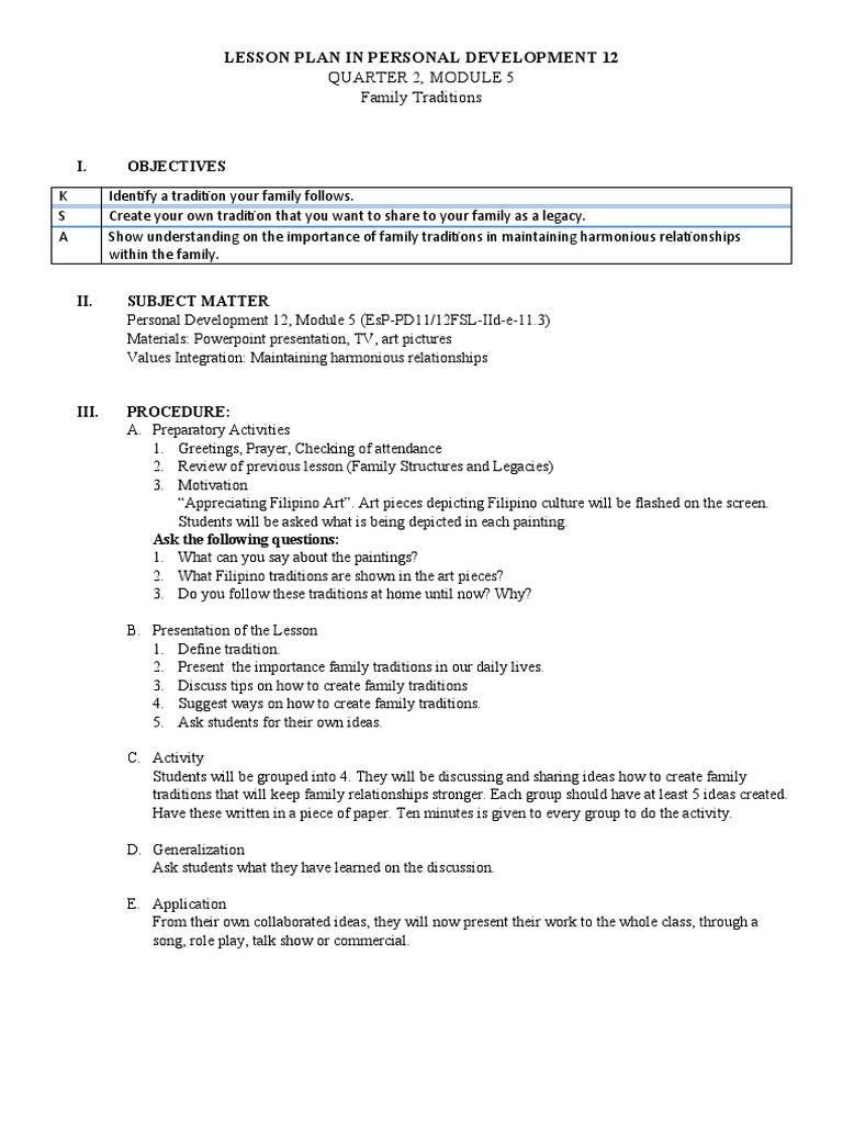 Lesson Plan in Personal Development 12 | PDF | Traditions ...
