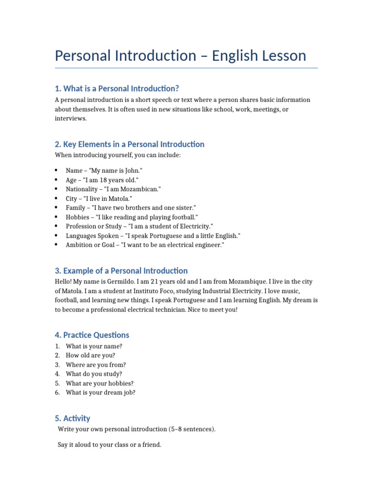 Personal Introduction Lesson | PDF