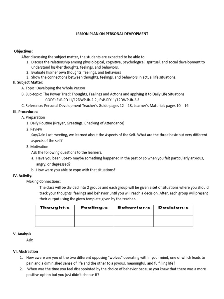 Lesson Plan On Personal Development Week 3 A | PDF | Thought | Feeling