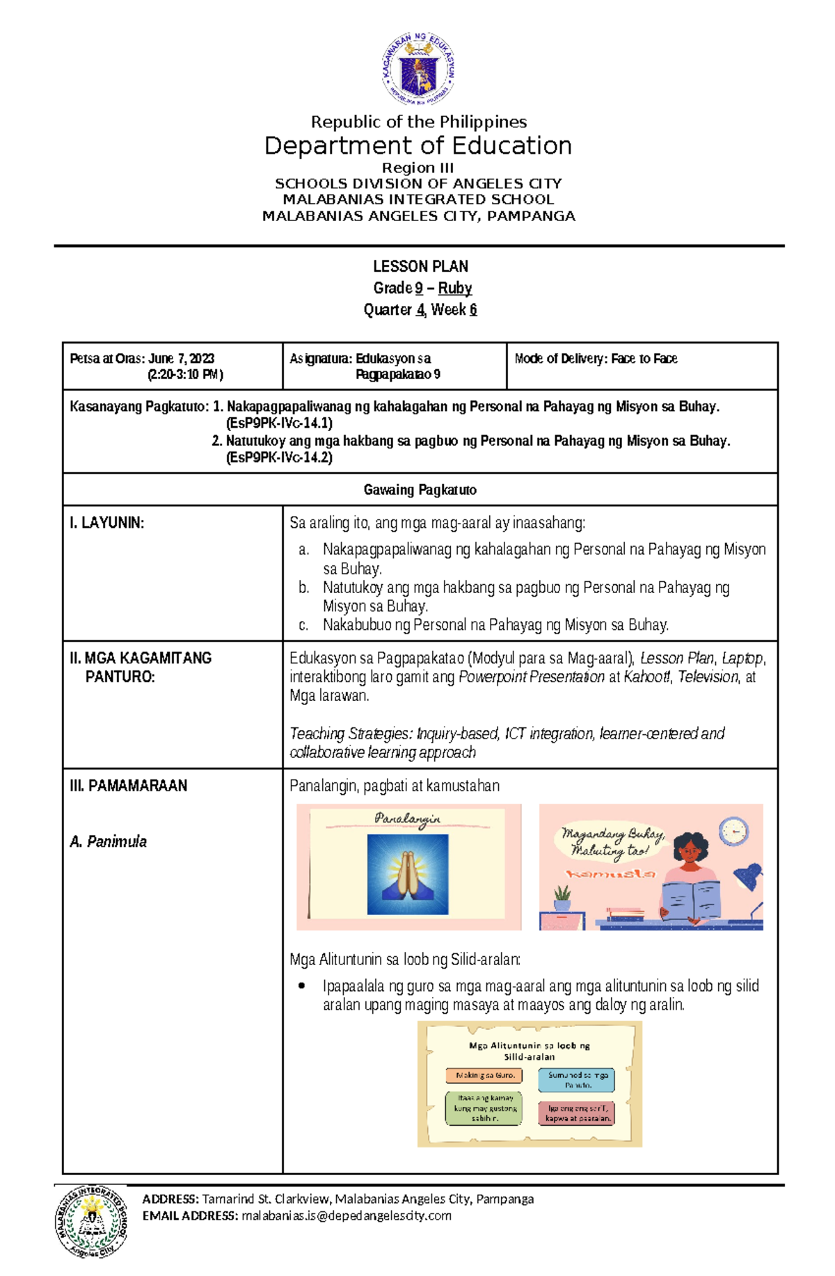 Q4-W6 Lesson Plan: Personal na Pahayag ng Misyon sa Buhay (EsP9PK-IVc ...