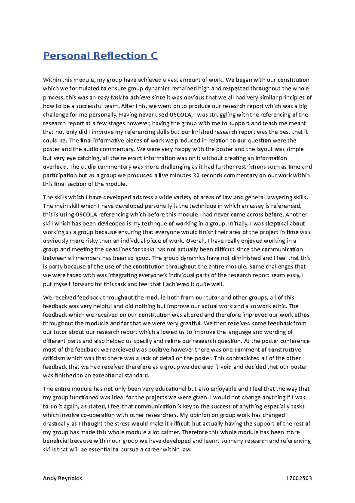 Personal Reflective Essay Sample