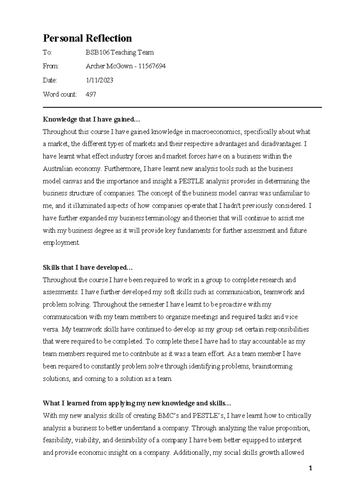 Reflection - GOOD - PERSONAL REFLECTION To: BSB106 Teaching Team From ...