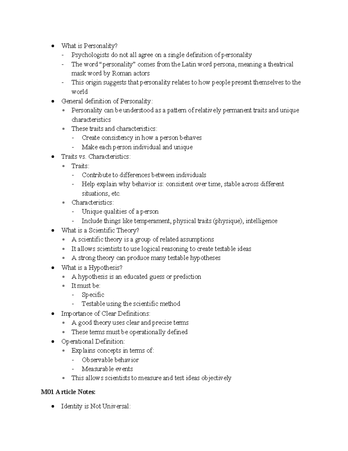 M01 Lecture Notes: Understanding Personality and Culture - Studocu