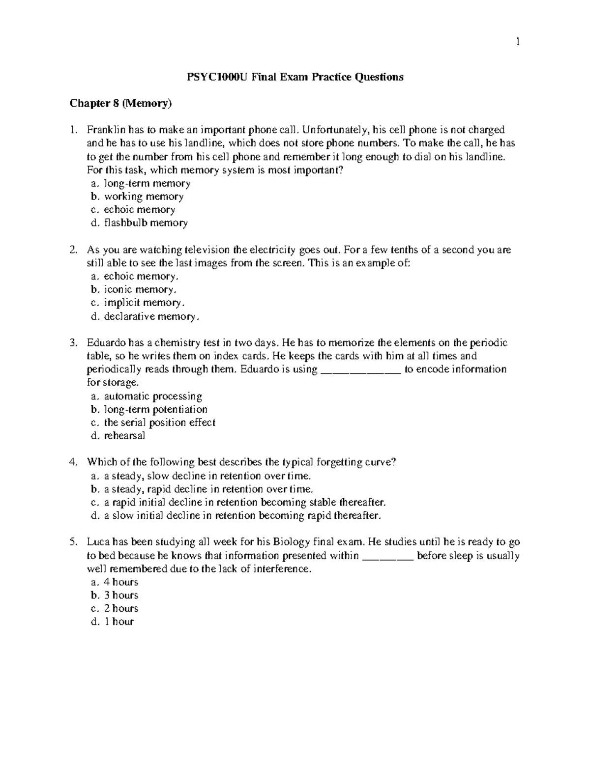 PSYC1000U Final Exam Practice Questions on Memory and Personality - Studocu