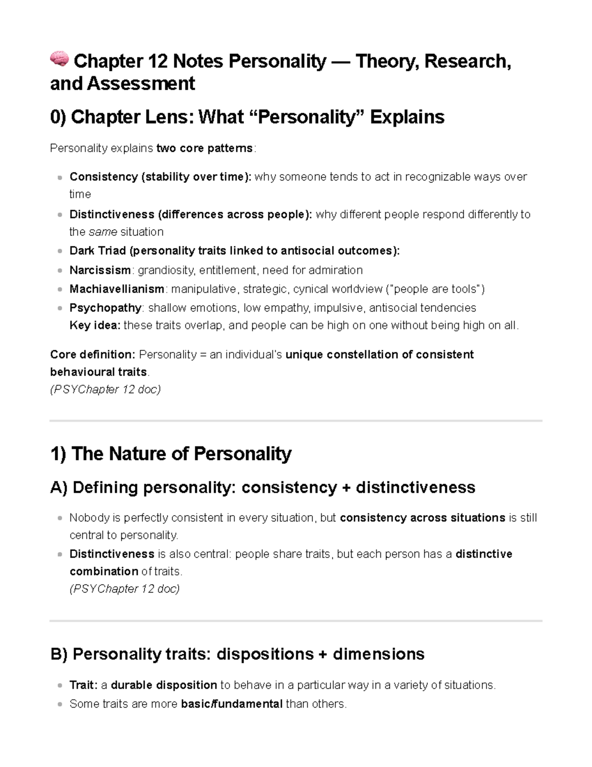 Personality Notes: Definitions, Factors, Theories