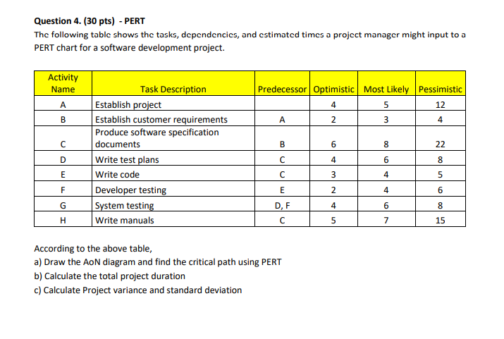 Solved Question 4. (30 pts) - PERT The following table shows | Chegg.com