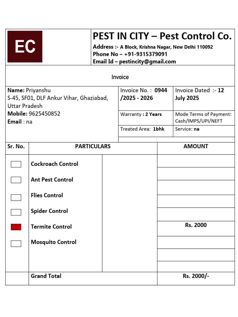 Pest Control Receipt Template, A pest control invoice records relevant ...