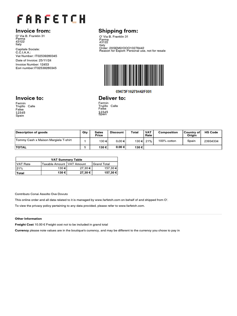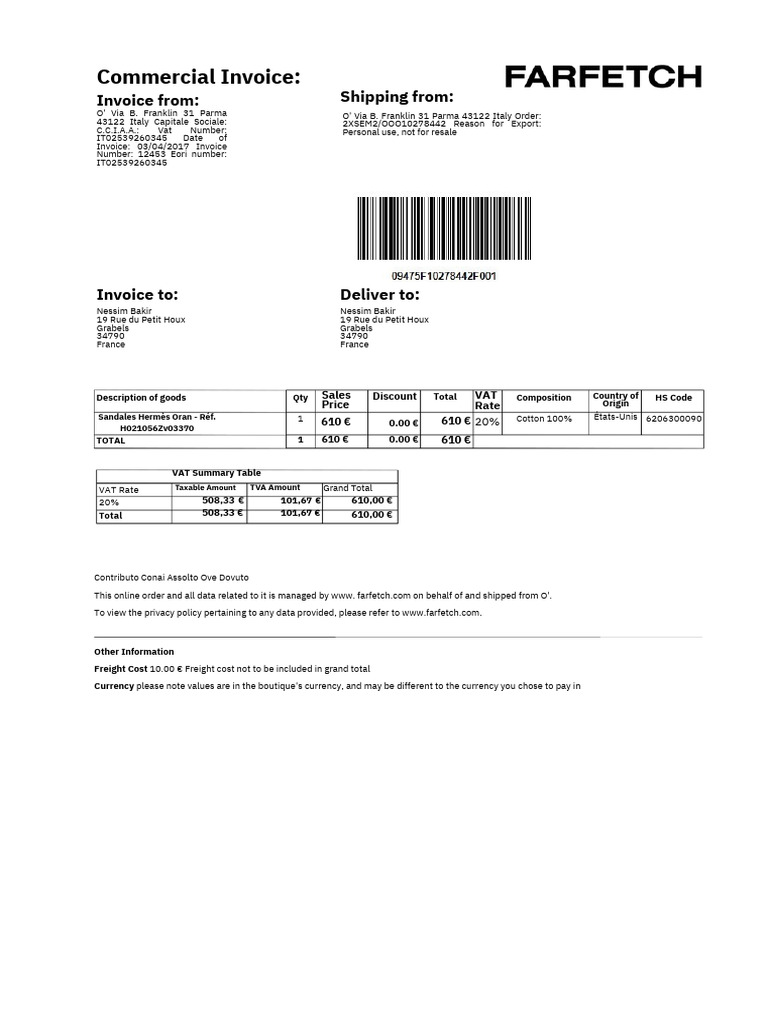 Farfetch Commercial Invoice Example | PDF | Value Added Tax | Invoice